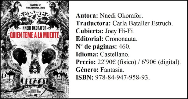 Es una novela que, a pesar de ser larga, también es muy fácil de leer, aunque sólo tengas el tiempo para leer en el metro. Al igual que Binti Hogar, Quien teme a la muerte es una ventana necesaria a una cultura y un continente distinta a la europea hegemónica en nuestra literatura.